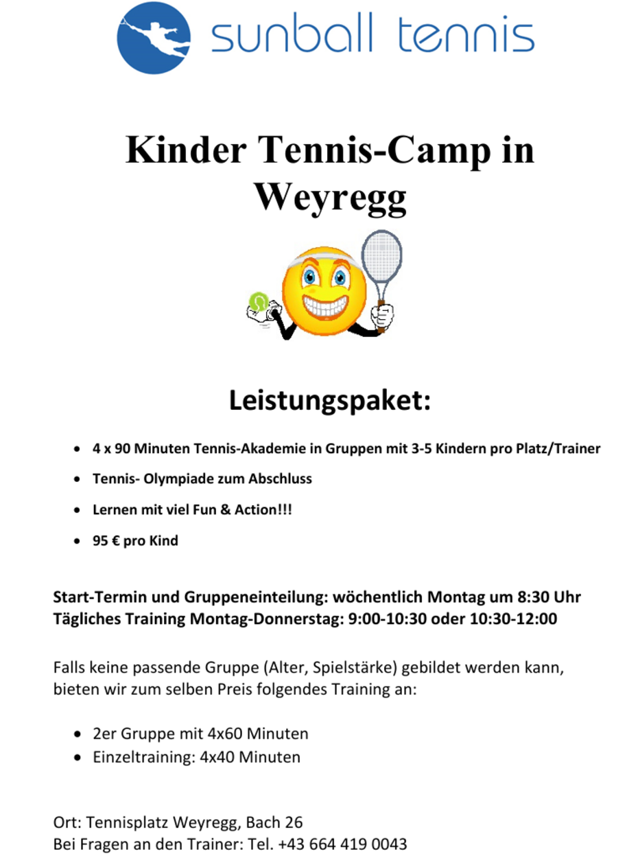 Die Tennisschule Sunball veranstaltet auf unserer Tennisanlage von Juli bis August wöchentlich Kurse für Kinder.